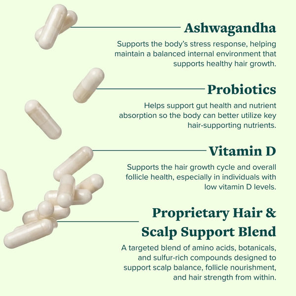 A healthy gut means better nutrient absorption. Our probiotics actively nourish the microbiome, helping balance the body and create the ideal environment for hair and scalp vitality.
